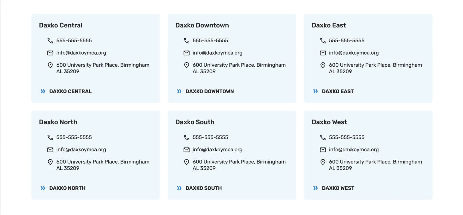 Use this module to display contact information in a card-based layout. Each card can include a title, phone, email, address, and a Call to Action (CTA) link. This section is repeatable, allowing you to add multiple cards for different locations, departments, or staff.