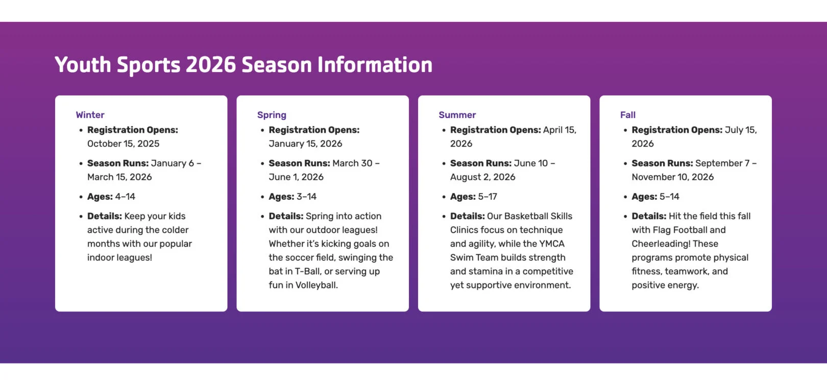 Use this module to present grouped information in a card layout. This module is ideal for displaying schedules, seasonal details, or key highlights where multiple items share a consistent structure.
